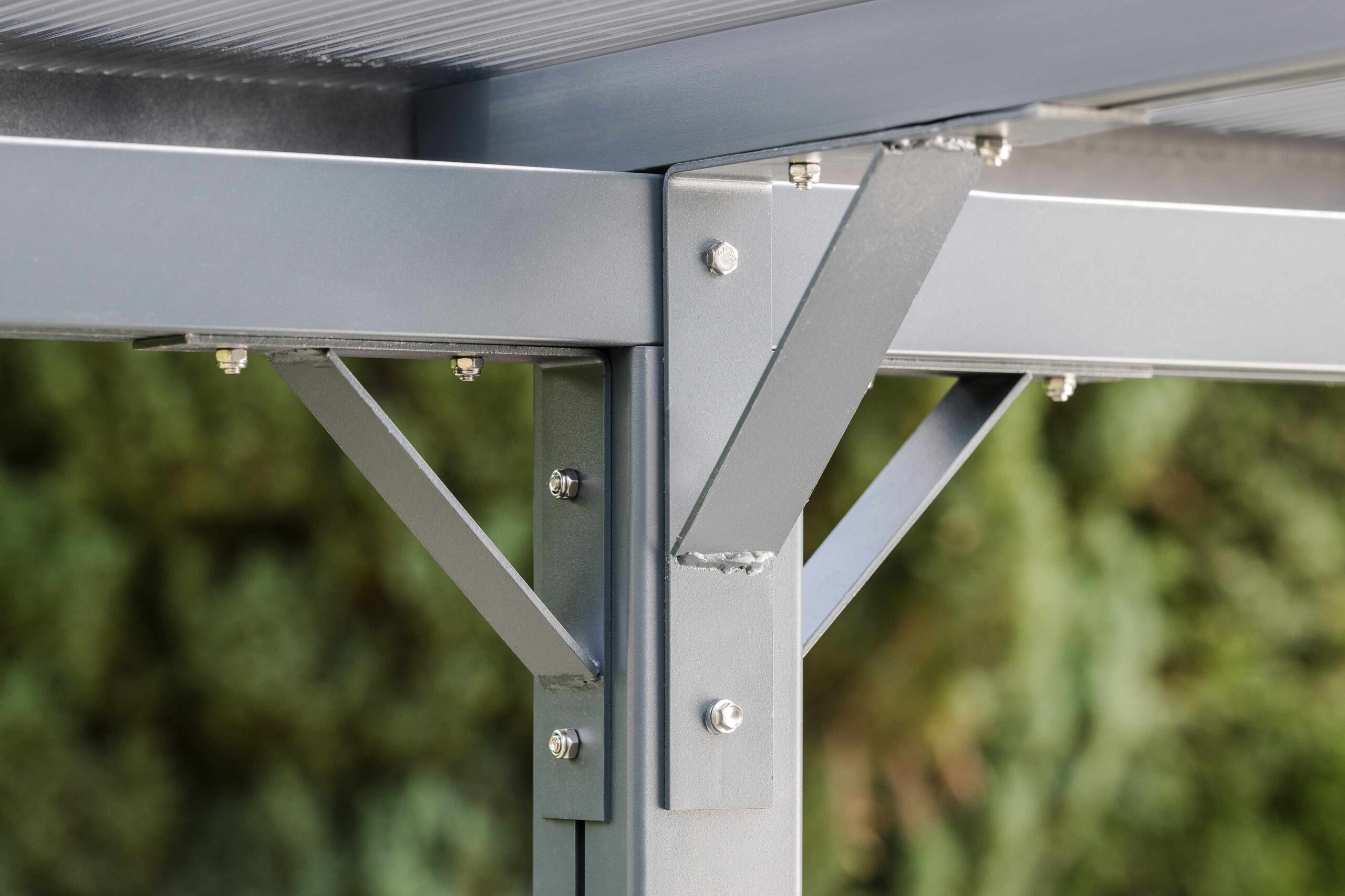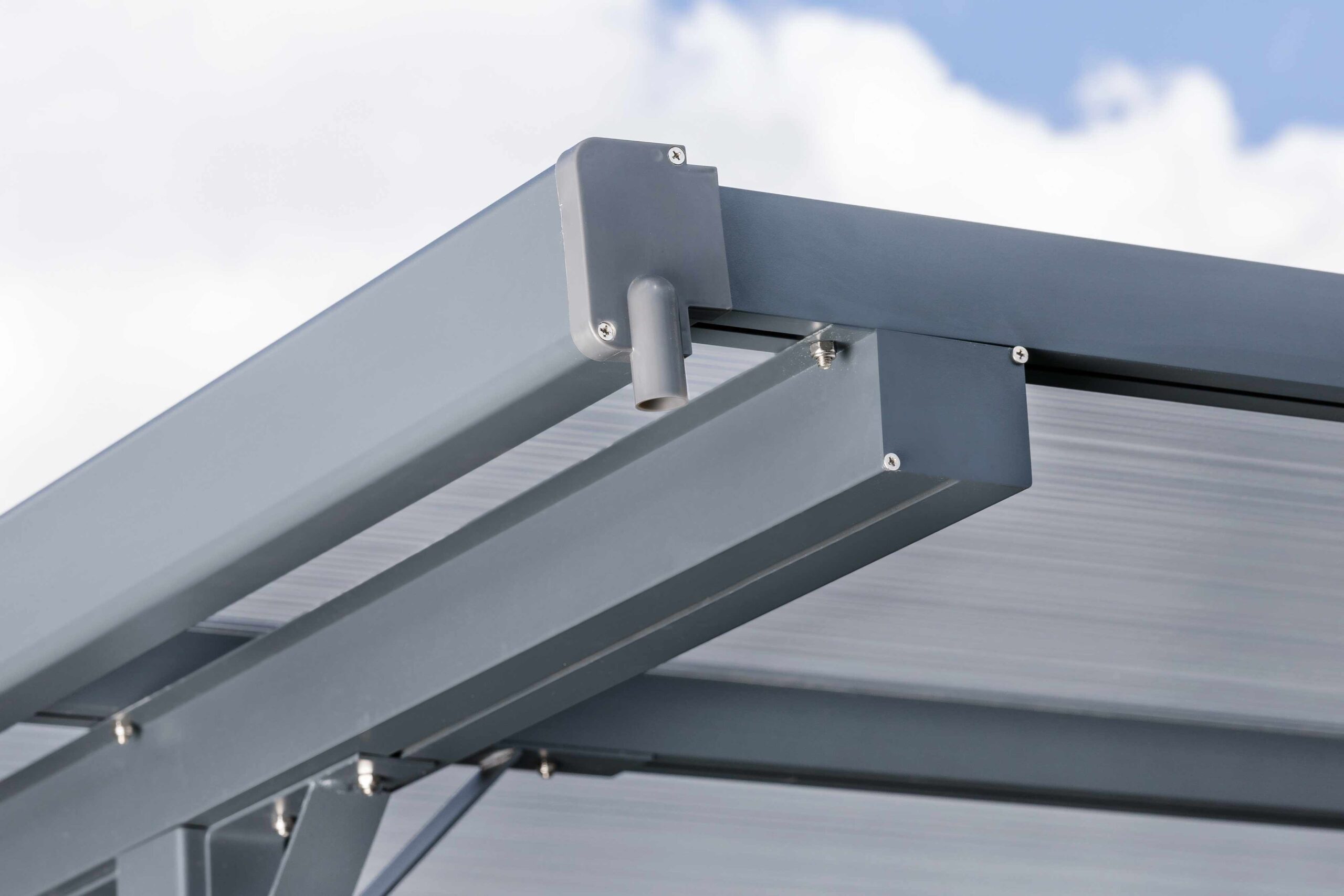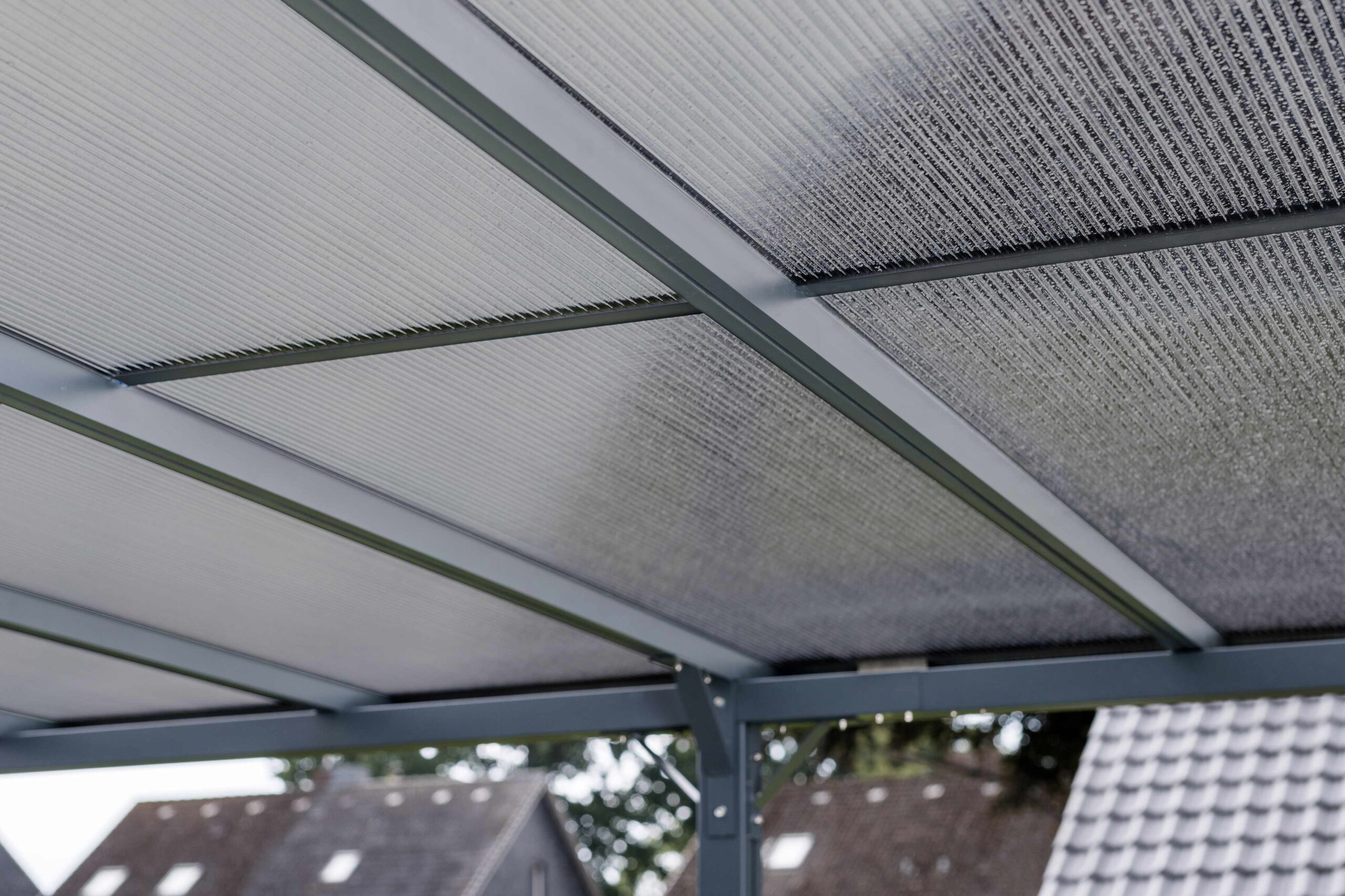 Mit einem hellgrau eingefärbten, transparenten Dach aus 18 auf Maß zugeschnittenen Dachplatten aus Polycarbonat und einer Beschichtung gegen UV-Strahlen wird Ihr Fahrzeug auch vor starker Sonneneinstrahlung geschützt. Es bleibt hell in Ihrem Carport und der Wagen im Sommer kühler.