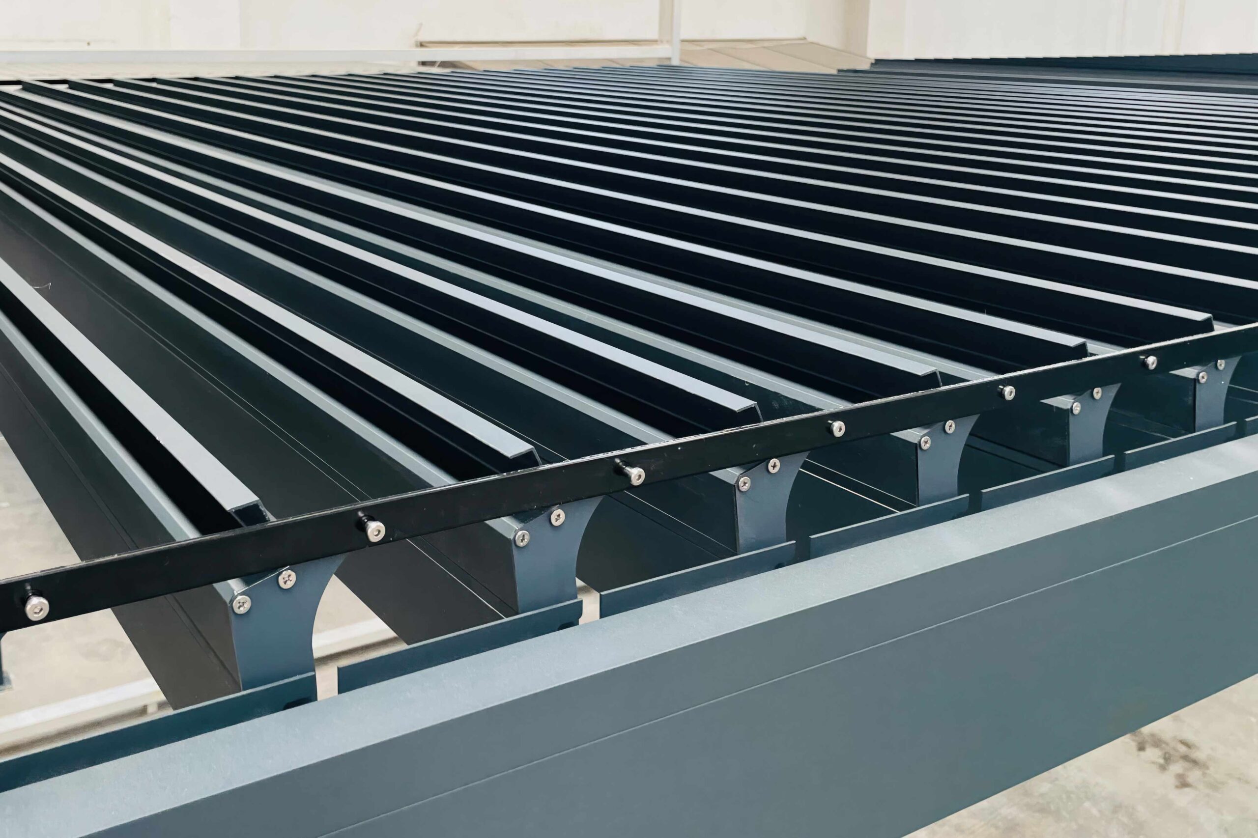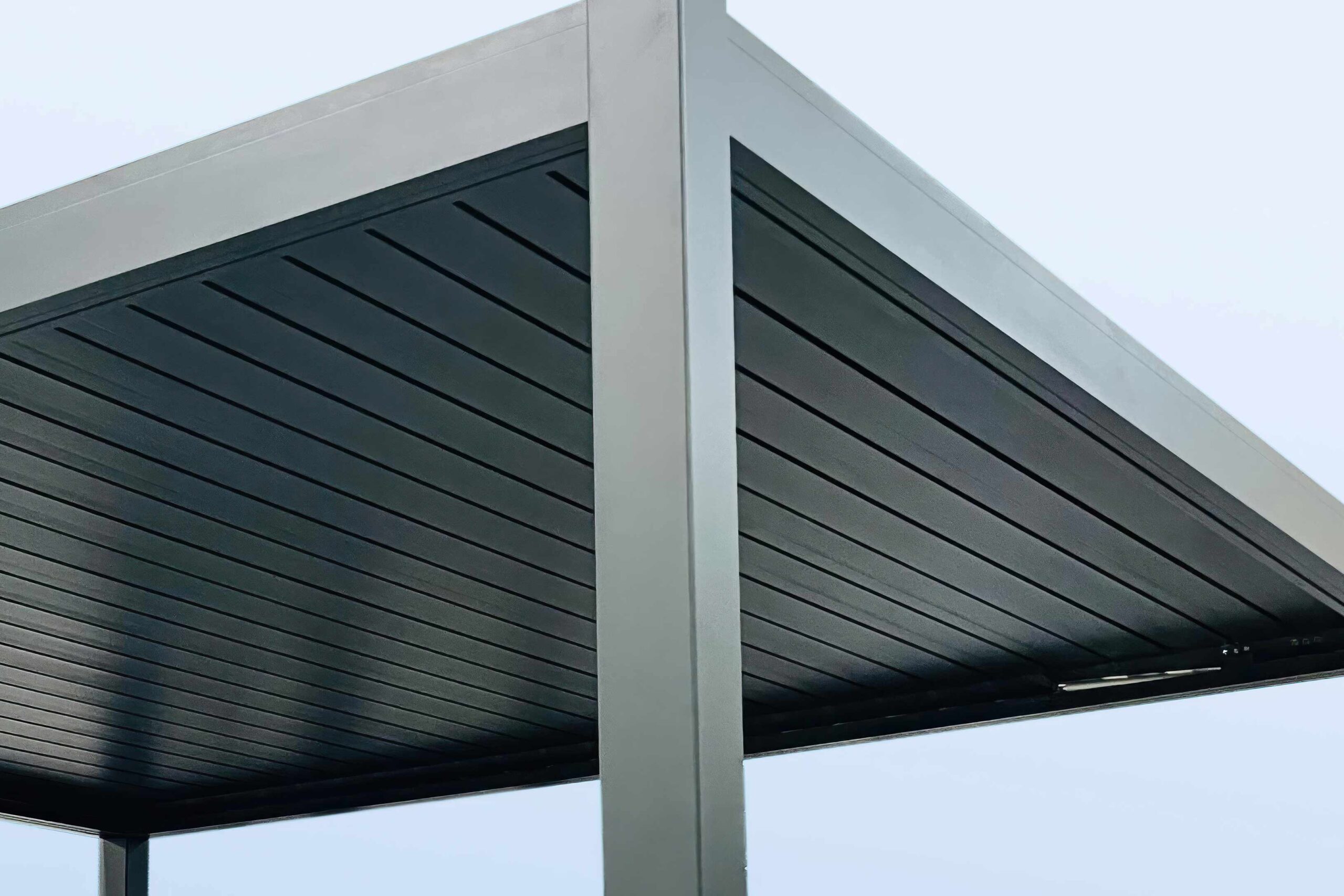 Die Dach-Lamellen mit Doppelprofil lassen sich je nach Modell per Motor oder Handkurbel um 0°– ca. 104° drehen. Möchten Sie die Sonne genießen, können Sie die Lamellen aufstellen. In geschlossener Position überlappen die einzelnen Lamellen und bilden einen dichten Schutz vor Regen.