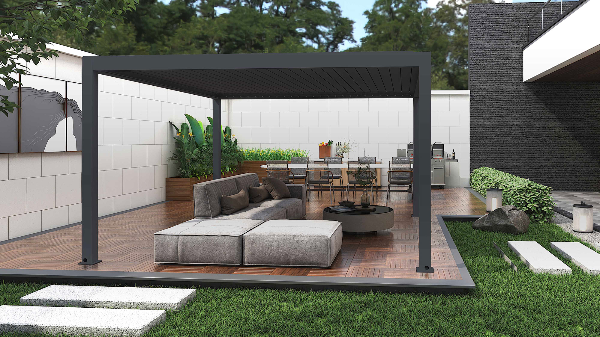 Genießen Sie die schönste Zeit des Jahres in vollen Zügen. Zur Arbeit, in Zweisamkeit oder als Familie unter dem schützenden Dach. Ein repräsentativer Ort zum Loslassen und Genießen. So schaffen Sie Raum für wertvolle Erinnerungen und harmonische Stunden. Unsere Pergola DeLux beeindruckt mit einem Dach aus speziell entwickelten Lamellen mit Doppelprofil. Neben der ruhigen, optisch geschlossenen Dachfläche bieten diese besonderen Lamellen mehr Stabilität, eine noch höhere Langlebigkeit und wirken bei starkem Regen schallreduzierend. Wertvolle Eigenschaften, die Ihrem exklusiven Lieblingsplatz noch ein wenig mehr Komfort geben.