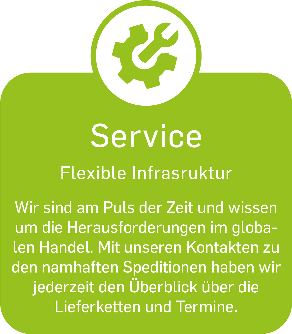 Unser Team besteht aus Groß-, Außenhandels- und Speditionskaufleuten. Jeder Einzelne von uns kennt die Abläufe unseres Unternehmens und ist in seinem Bereich ein Spezialist. Arbeiten in einem kleinen Team bedeutet für Sie kurze Wege, individuelle Beratung und persönlicher Kontakt. Damit Sie sehen, was Sie bekommen, werden unsere Produkte durch erfahrene Fotografen und Grafik-Designer ins rechte Licht gerückt. In der Logistik arbeiten wir mit verlässlichen Partnern in Europa und Asien für eine termingerechte, effiziente und risikoarme Warenlieferung zusammen. Die Rücknahme der Transportverpackungen erfolgt durch unseren Dienstleister INTERZERO.